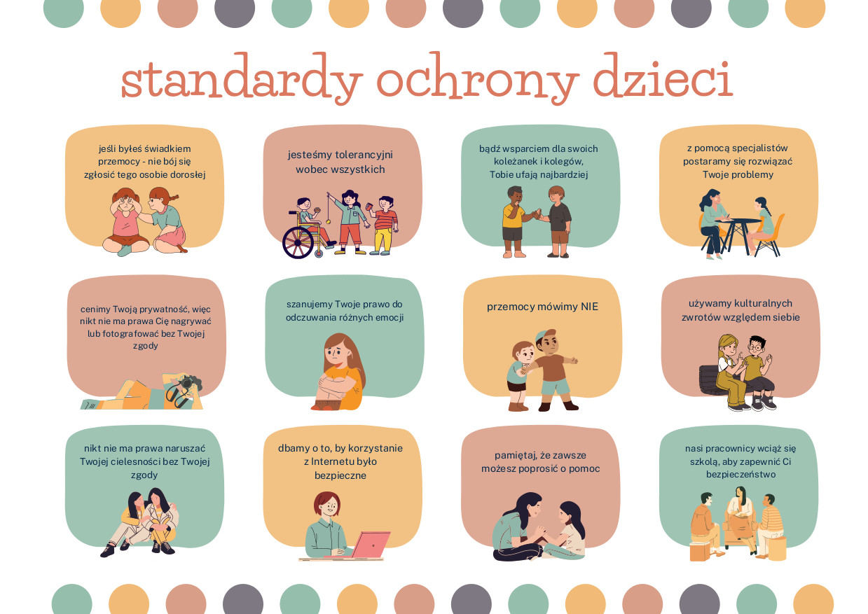 - Pracownicy dbają o tworzenie odpowiednich relacji z dziećmi, właściwych dla osób dorosłych, opartych na szacunku, zaufaniu i respektowaniu odpowiednich granic w komunikacji i kontakcie fizycznym.